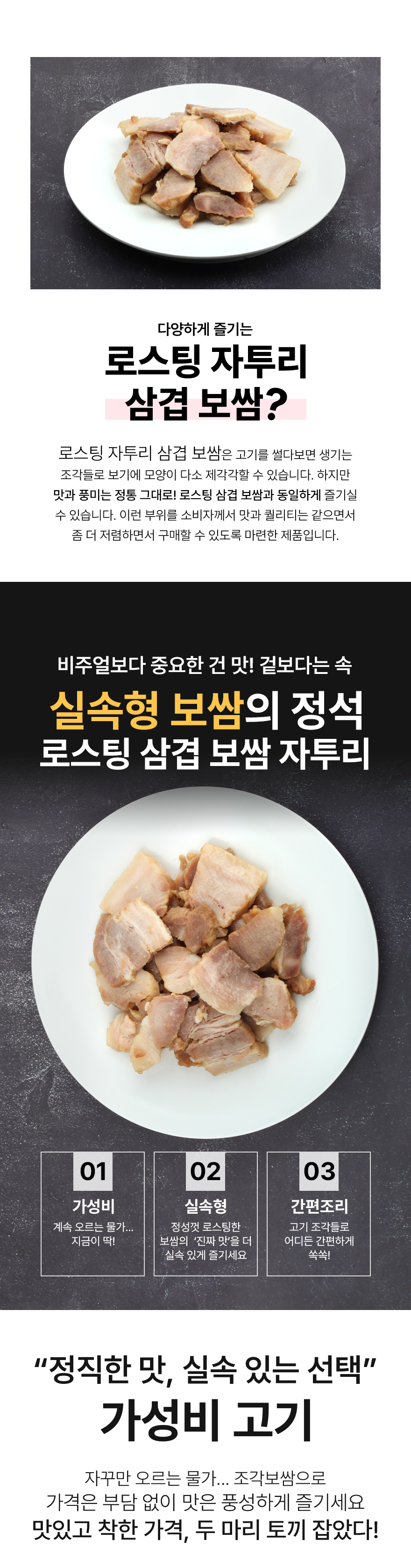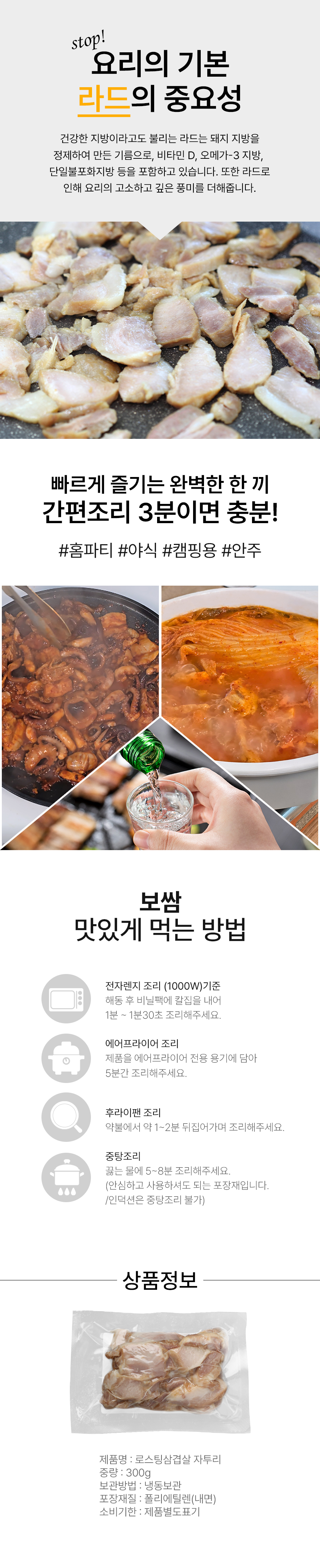 | 로스팅바베큐삼겹 | 제품명:로스팅삼겹살 / 식품의유형:양념육(비살균제품)/가열하여섭취하는 냉동식품 / 품목보고번호:2019019101631 / 중량:300g / 포장방식:진공포장 / 제조원 및 판매원: (주)푸드스토어 / 소비자상담실:1566-6723 / 반품 및 교환:구입처 | ||