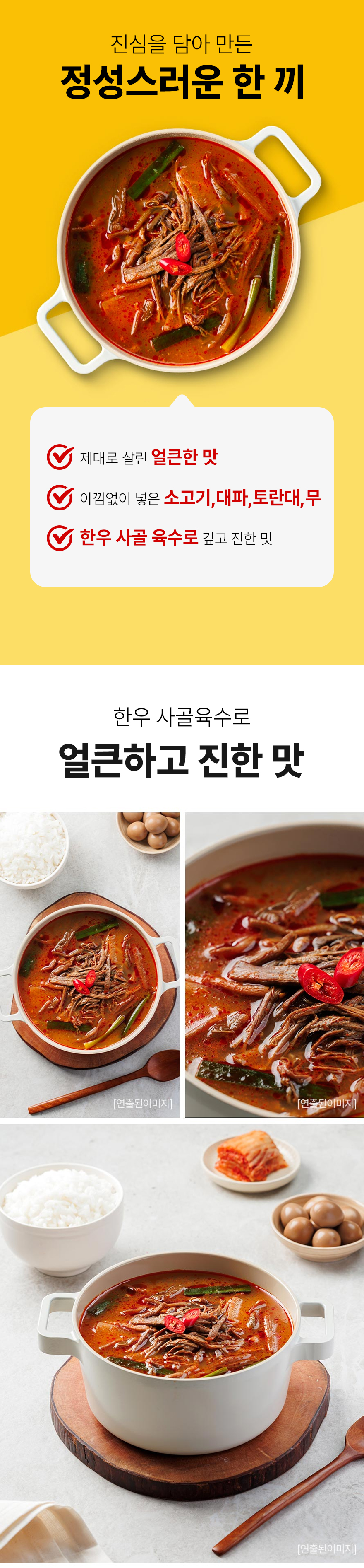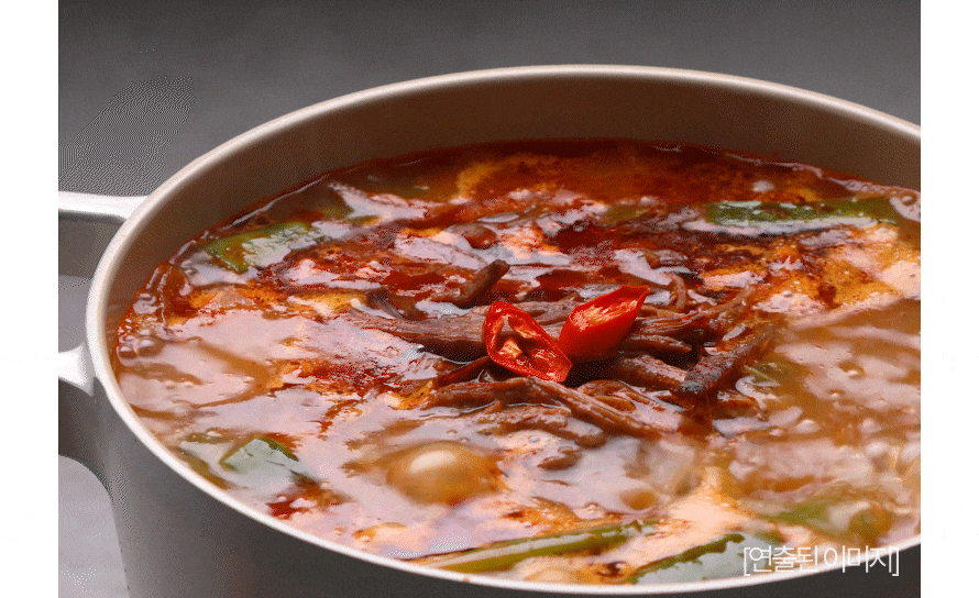 | 원재료명 및 함량 | 정제수,대파(중국산),토란줄기(미얀마산),소정육(호주산)3.0%,무,복합조미식품,식용우지,고춧가루,마늘,콩기름,된장,혼합간장,한우사골농축액-KD 0.23%[한우사골농축액88%{한우사골(국내산),가용성고형분함량52%}],생강,양파,가공소금,참기름,흑후추분말,향미증진제 쇠고기,대두,밀 함유 | ||