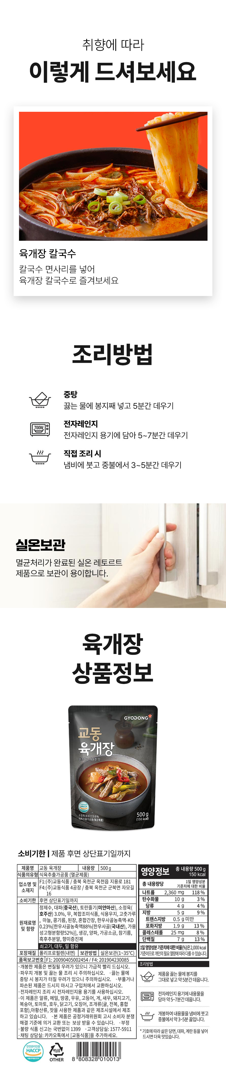 | 하우촌갈비탕 | 제품명:교동 육개장 / 식품의유형:식육추출가공품(멸균제품) / 품목보고번호: F1:20090405002454 / F2:201904230085/ 내용량:500g / 제조원:F1:(주)교동식품, F4:㈜교동식품 4공장 / 판매원:(주)푸드스토어 / 소비자상담실:1566-6723 / 반품 및 교환:구입처 | ||