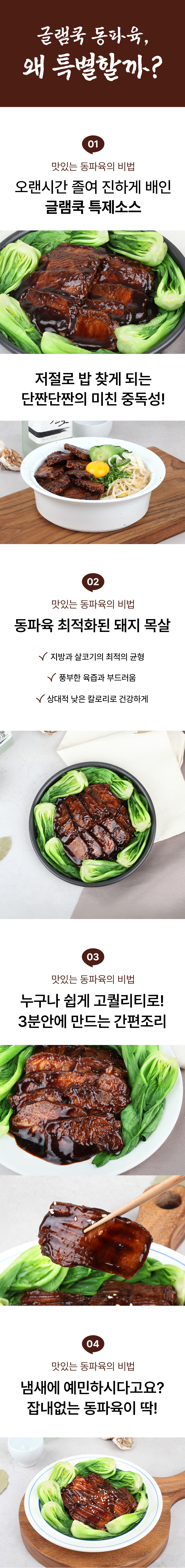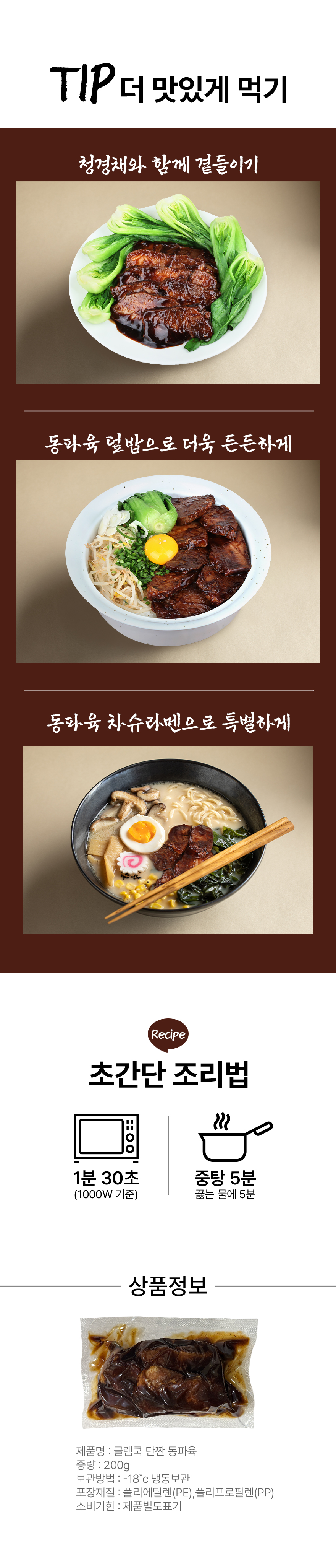 | 바베큐폭립 | 제품명 : 글램쿡단짠동파육/ 식품의유형 : 양념육(비살균제품,가열하여 섭취하는 냉동식품) / 품목보고번호 : 20190191016164 / 중량 : 200g / 제조원 및 판매원 : (주)푸드스토어 / 소비자상담실 : 1566-6723 / 반품 및 교환 : 구입처 | ||