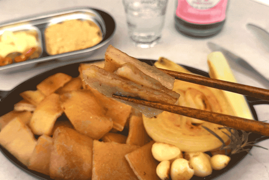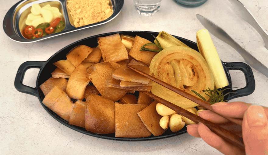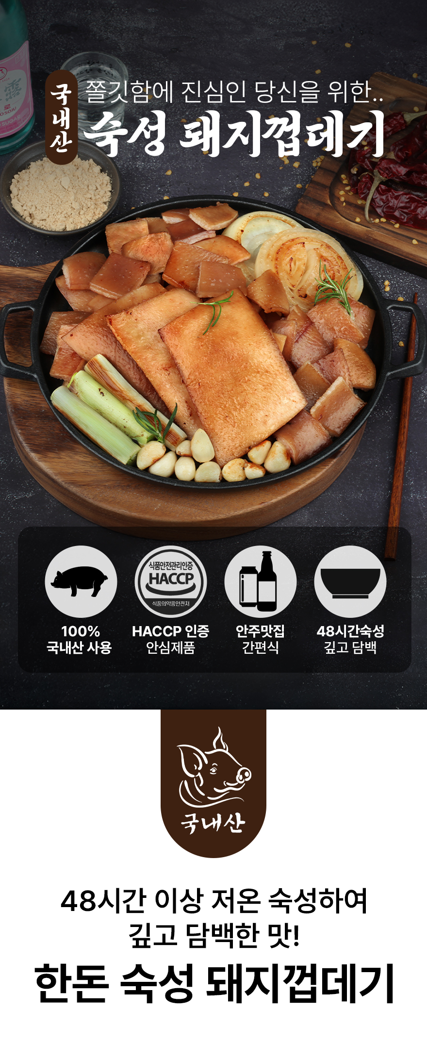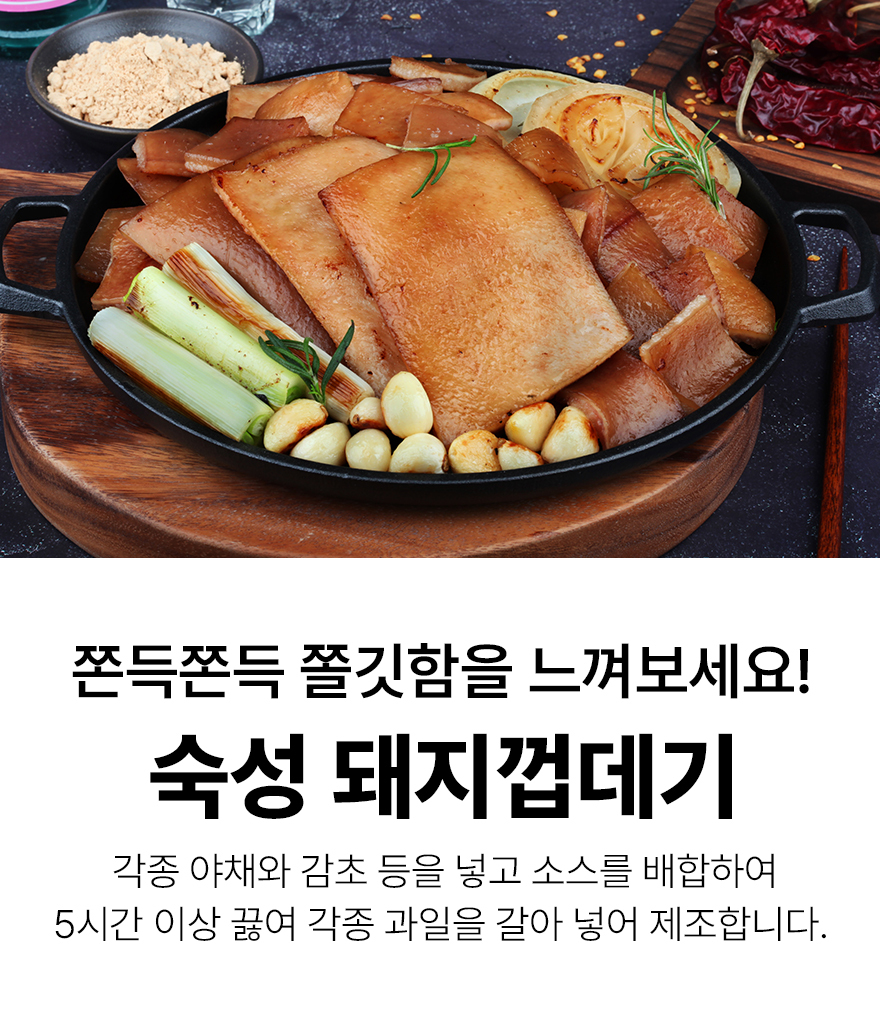 | 원재료명 및 함량 | 돼지껍데기63%(국내산),정제수,배퓨레{배(국산),비타민C},혼합간장[산분해간장{탈지대두(외국산:인도,미국,중국등)},양조간장{탈지대두(인도산),소맥(밀:미국산)}],갈색설탕,간양파(국내산),간마늘(국내산),미향,굴소스,파인애플퓨레,키위퓨레,미원,카라멜색소,쇠고기다시다,순흑후추 | ||