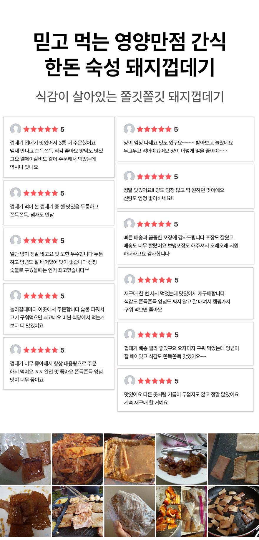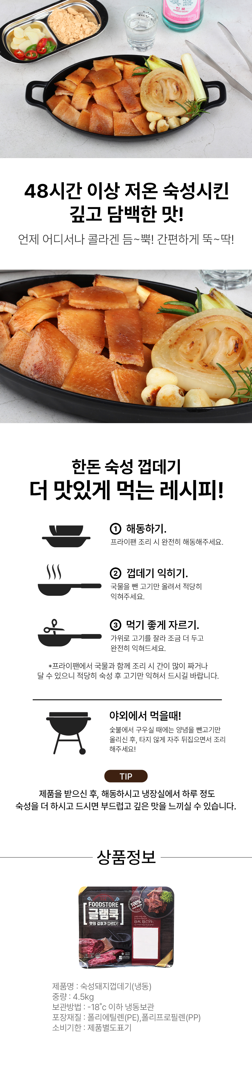 | 숙성돼지껍데기 | 제품명:숙성돼지껍데기 / 식품의유형:양념육(비살균제품/가열하여 섭취하는 냉동식품) / 품목보고번호2019019101630 / 중량:4.5 kg / 제조원 및 판매원: (주)푸드스토어 / 소비자상담실:1566-6723 / 반품 및 교환:구입처 | ||