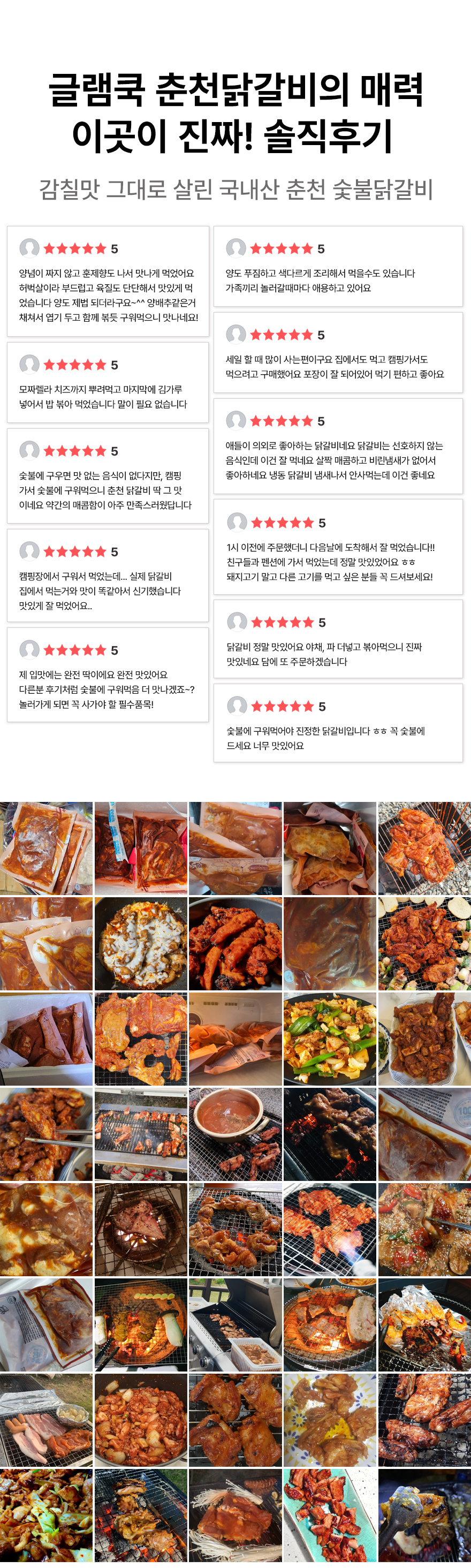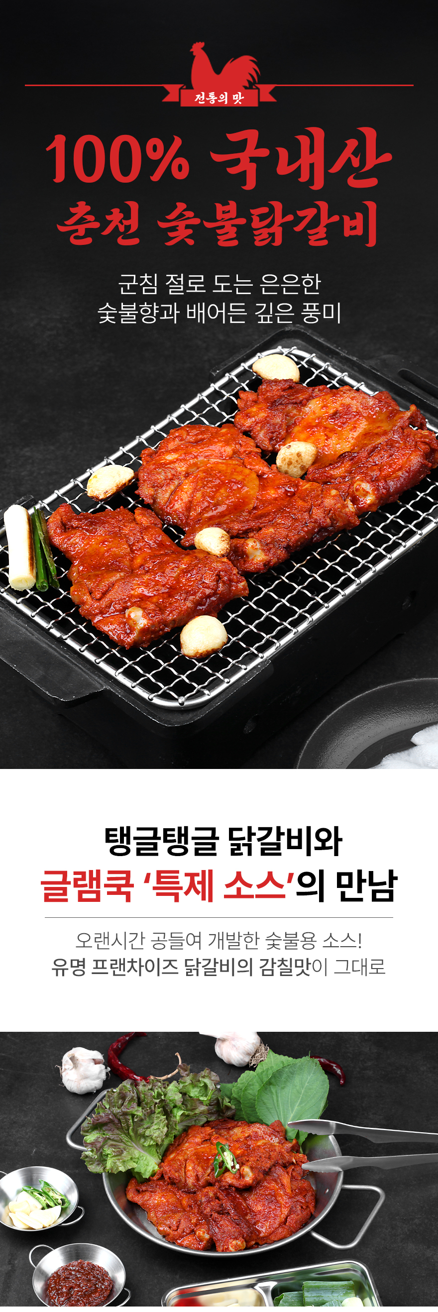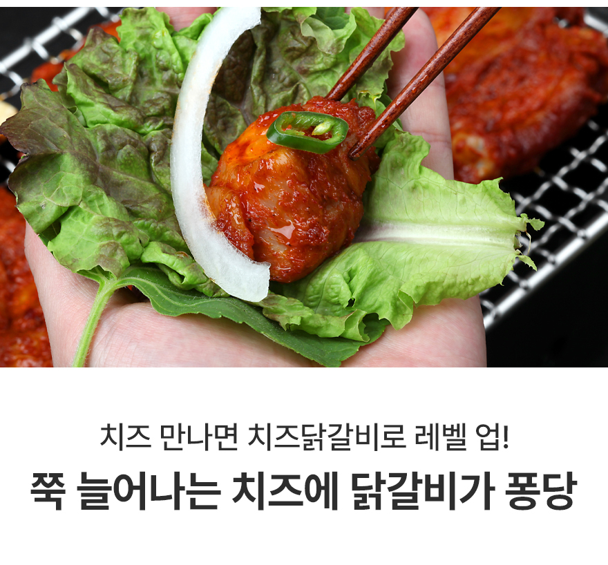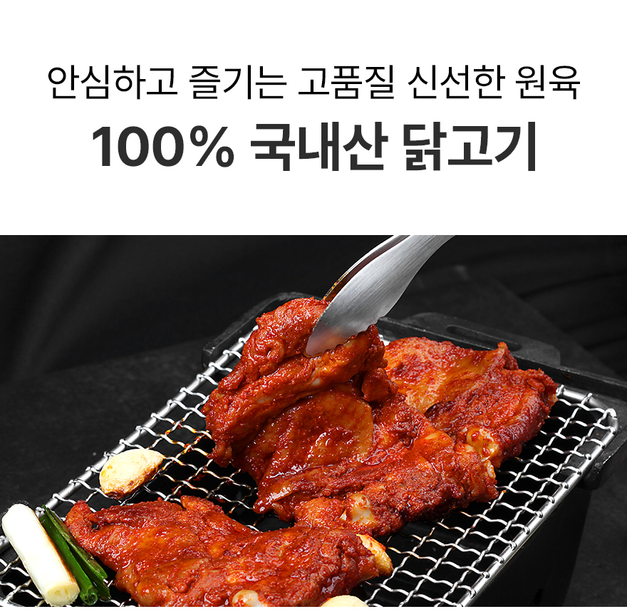 | 원재료명 및 함량 | 닭정육77%(국내산),글램쿡숯불닭갈비양념[간장{탈지대두(외국산),천일염(호주산),소맥(미국산)},대파,정백당,강촌양념-ES {고추장(물엿,소맥분(밀:미국산,호주산))복합조미식품(정제염(국산),쇠고기분말(쇠고기:호주산)),L글루타민산나트륨(향미증진제),흑후추분말,뉴슈가}고춧가루(중국산)] | ||